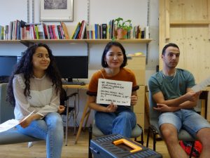 Als wir uns dann am zweiten Samstag trafen, trugen wir unsere Ideen und unser gesammeltes Material zusammen und überlegten uns ein Sendungskonzept und einen Sendungsplan. 60 Minuten galt es zu befüllen. Das war eine große Herausforderung, aber wir lernten uns zu unterstützen, denn jeder von uns hatte eine Stärke die er/sie einbringen konnte. Wir bereiteten also eine Live Diskussion zu dem Thema „In drei Jahren“ vor, außerdem machten wir ein kleines Hörspiel und überlegten und Lieder die wir zwischendurch abspielen wollten.