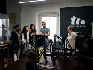 „Am ersten Tag gab es einen theoretischen Input, dabei lernten wir die Radiogeschichte kennen, den Unterschied zwischen öffentlich-rechtlichen, privaten und freien Radios kennen. Wir lernten die verschiedenen Beitragsarten kennen und einiges über Sendungsgestaltung. Außerdem gab es einen kurzen Input zu Medien- und Urheberrecht. Mittels eines Spieles mussten wir in Teams herausfinden, welche Inhalte im Radio ausgestrahlt werden dürfen. Wir überlegten uns dann ein Thema, welches wir bis zum nächsten Termin vorbereiten konnten: es hieß: „In 3 Jahren“. Also überlegten wir uns in der kommenden Woche wie unser Leben in 3 Jahren wohl aussehen wird und was wir bis dahin erleben. Einer der Stipis machte dafür ein Interview mit seinem Klassenvorstand, andere bereiteten Live-Interviews vor.