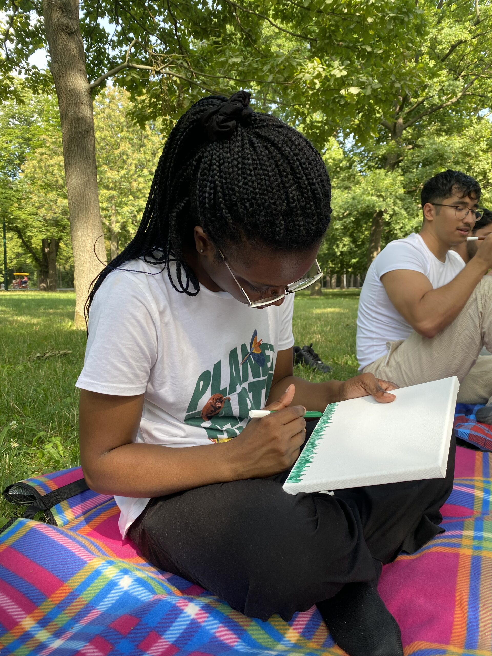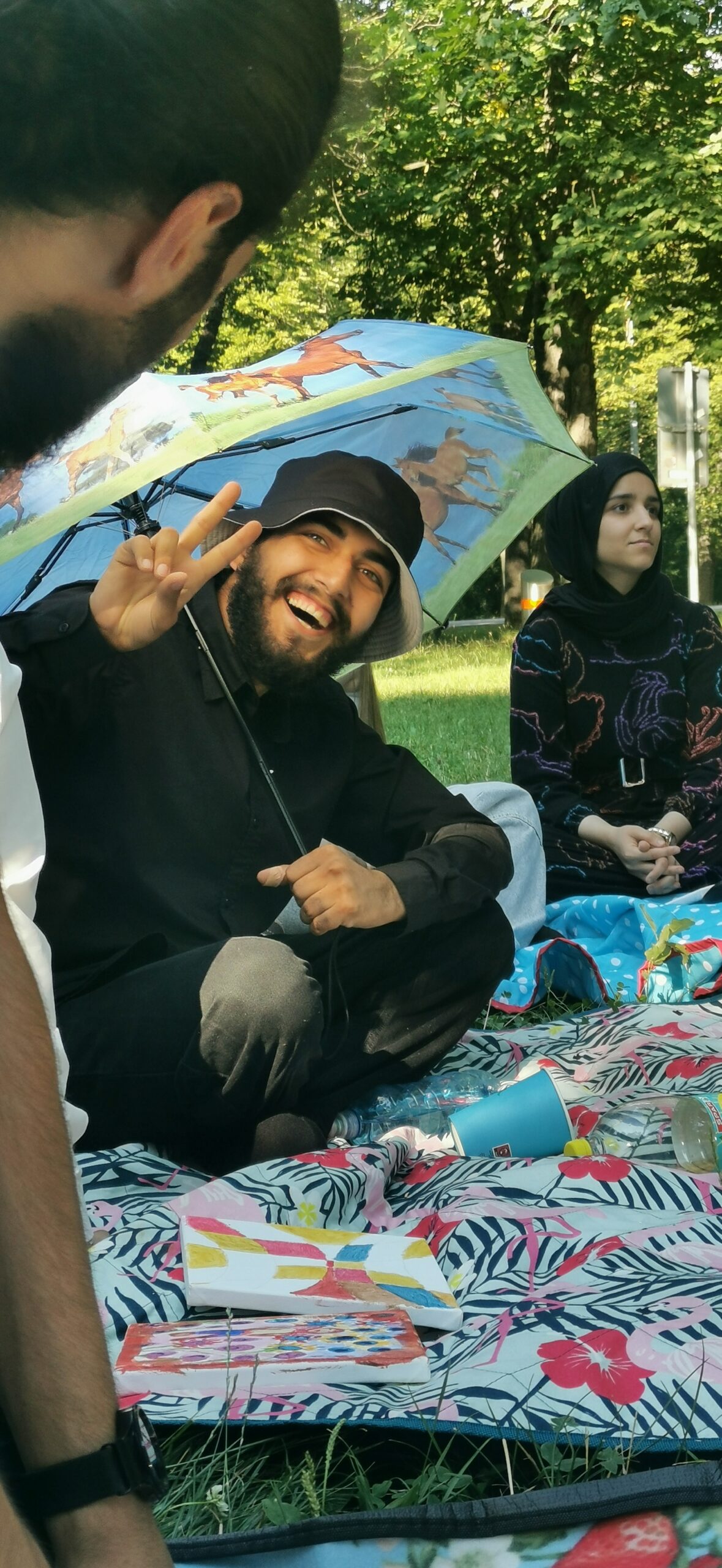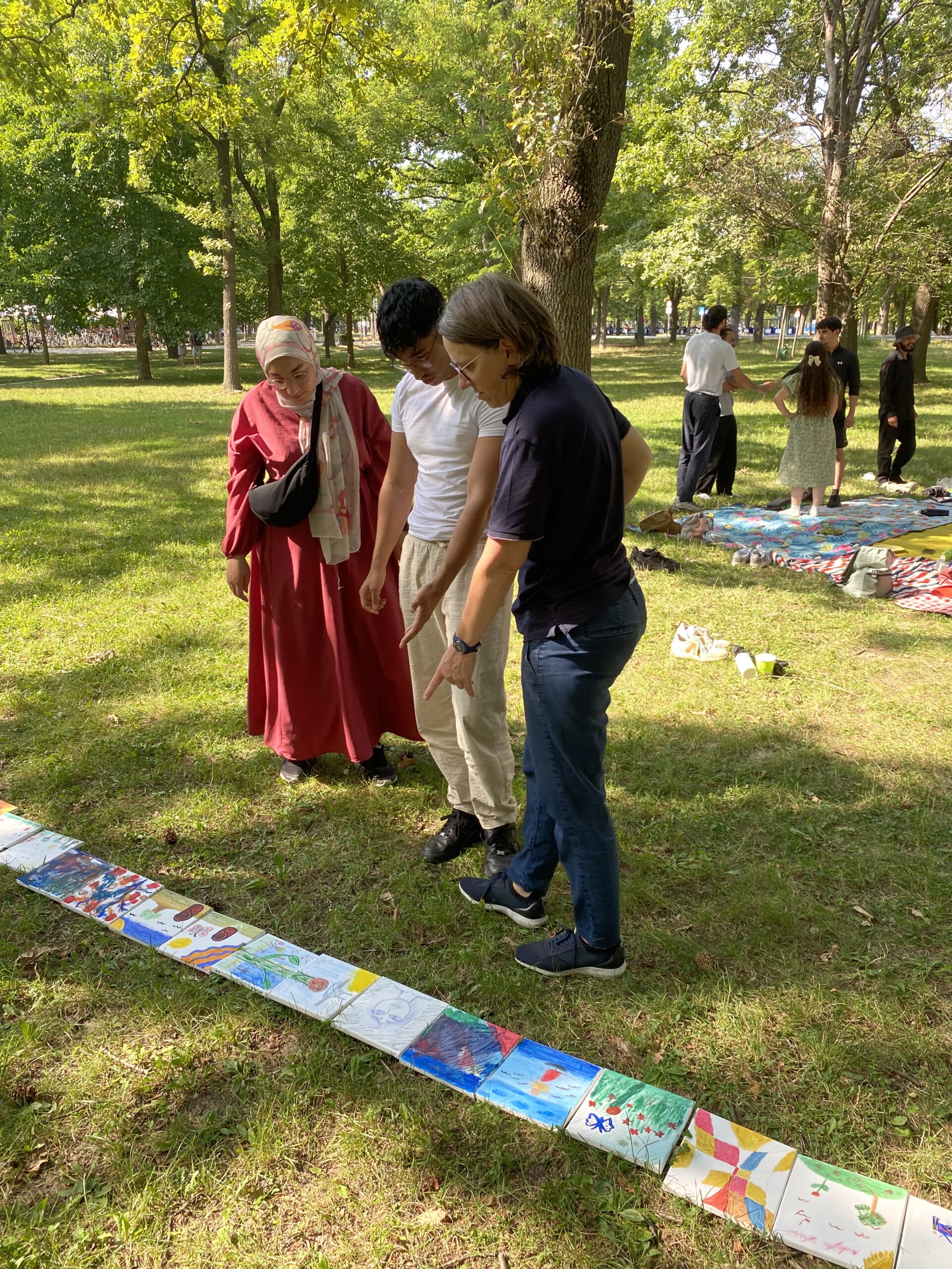 Das Picknick mit START war ein wunderschönes Zusammensein. Ich bin mir sicher, dass uns allen das Beisammensein sehr gut getan hat, weil wir in der Natur waren und das Wetter perfekt mitgespielt hat.Die Stipendiatinnensprecherinnen hatten sich eine kreative Malaufgabe für uns überlegt: Wir wurden in Zweierteams eingeteilt und haben jeweils zwei Leinwände bekommen. Alle fünf Minuten tauschten wir die Leinwände mit unserem Partner oder unserer Partnerin, sodass wir abwechselnd weiterzeichnen konnten und das wiederholten wir mehrmals. Am Ende durfte jeder die entstandenen Kunstwerke als eine schöne Erinnerung mit nach Hause nehmen. ~ Zainab