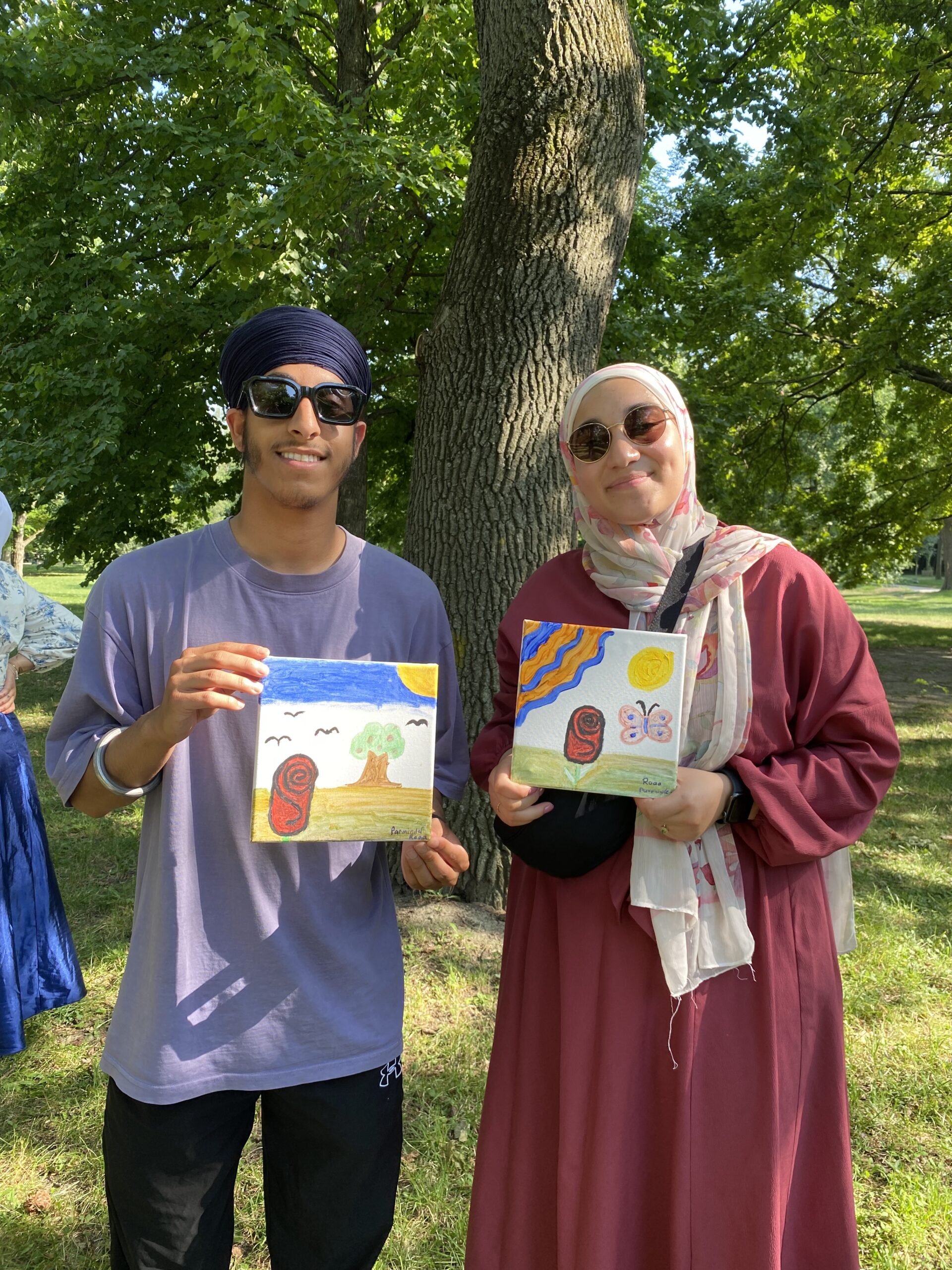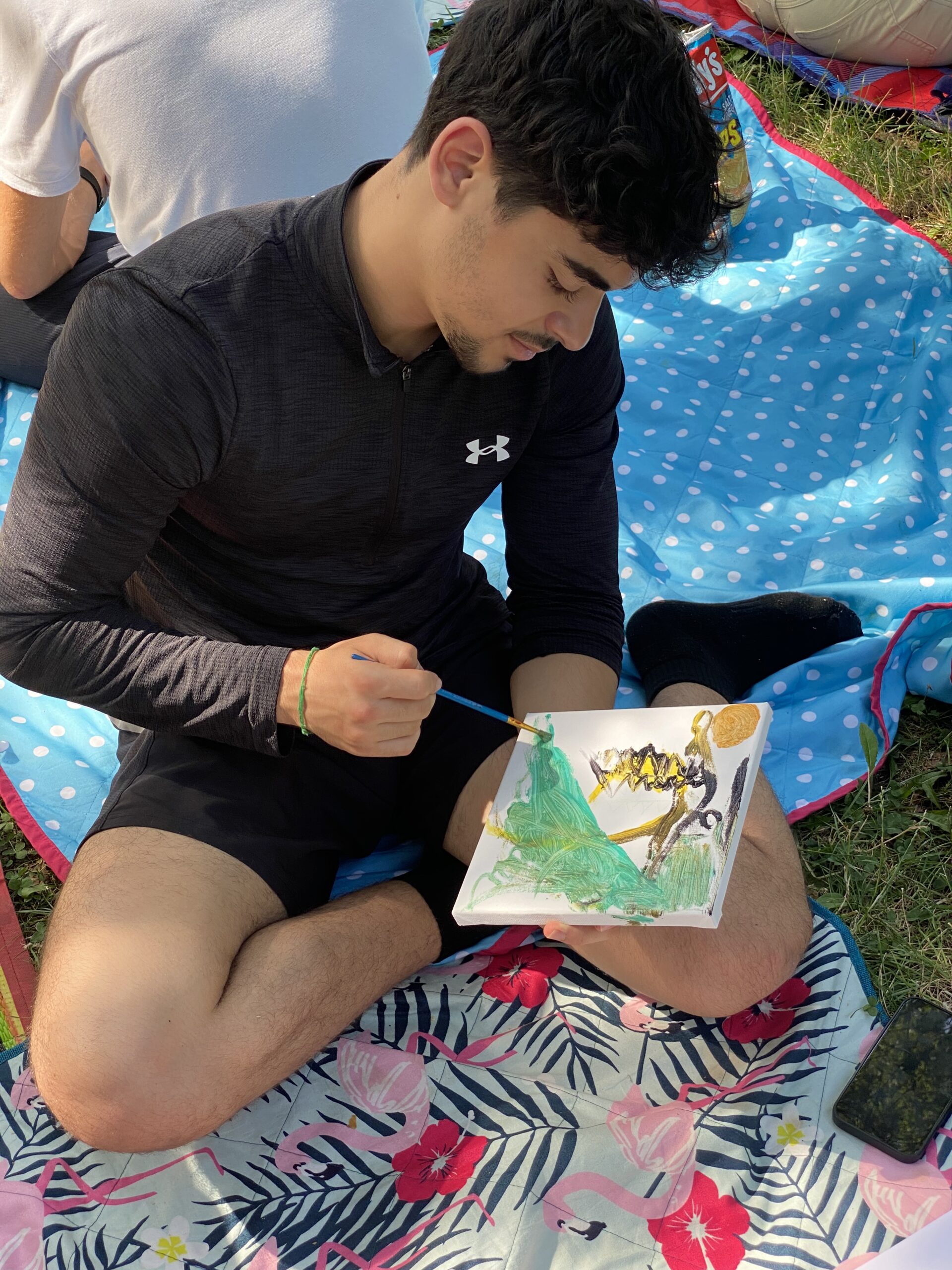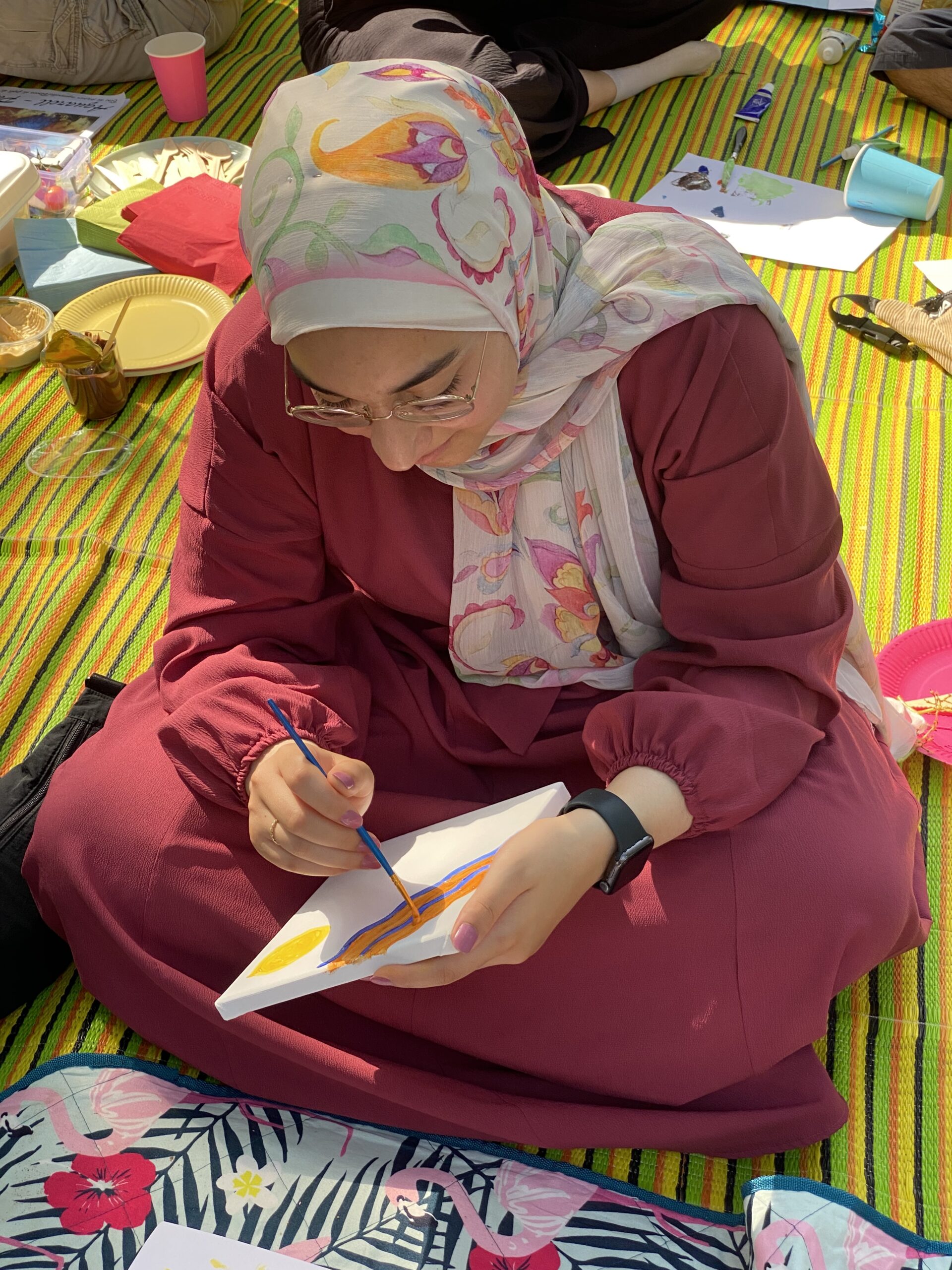 Das Picknick mit START war ein wunderschönes Zusammensein. Ich bin mir sicher, dass uns allen das Beisammensein sehr gut getan hat, weil wir in der Natur waren und das Wetter perfekt mitgespielt hat.Die Stipendiatinnensprecherinnen hatten sich eine kreative Malaufgabe für uns überlegt: Wir wurden in Zweierteams eingeteilt und haben jeweils zwei Leinwände bekommen. Alle fünf Minuten tauschten wir die Leinwände mit unserem Partner oder unserer Partnerin, sodass wir abwechselnd weiterzeichnen konnten und das wiederholten wir mehrmals. Am Ende durfte jeder die entstandenen Kunstwerke als eine schöne Erinnerung mit nach Hause nehmen. ~ Zainab