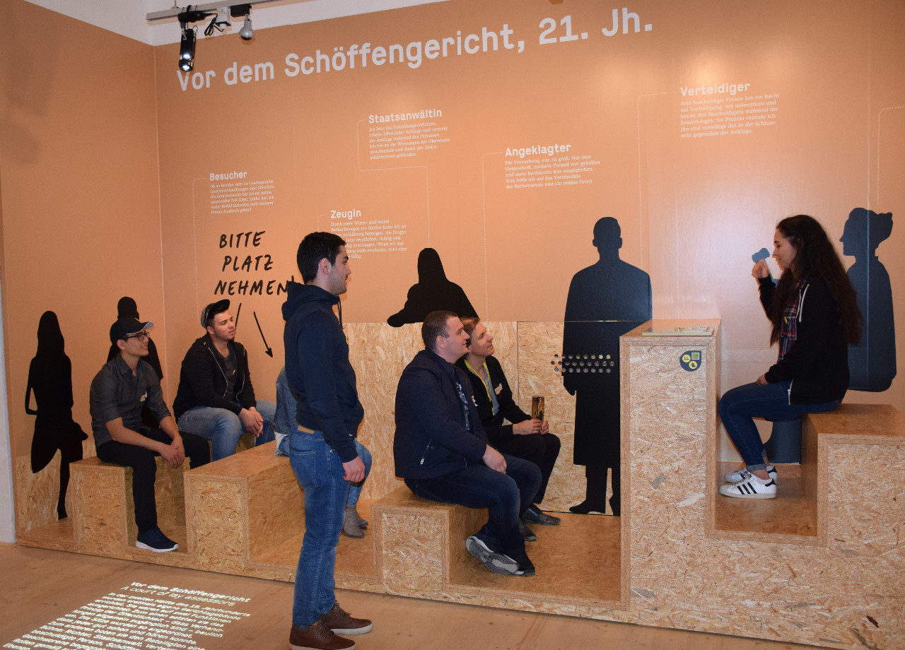 Besonders gefiel mir jener Teil, wo jede und jeder von uns ein Bild zum Thema Recht beschreiben sollte, um gemeinsam darüber zu diskutieren. Mein Bild zeigte eine Szene aus einem Gerichtssaal. Sehr interessant für mich war auch, dass früher die Prozesse geheim abgehalten wurden und heute öffentlich, meist vor Publikum und mit Schöffen, die über die Schuld und Unschuld bestimmen, stattfinden. Mir war auch nicht klar, dass eine Gefängniszelle so klein ist – kleiner als der Parkplatz eines Autos. Das gefiel mir gar nicht. Mir gefielen aber die vielen Sprüche über Recht und Gerechtigkeit, die sich durch die ganze Ausstellung zogen. Ich fotografierte viele davon.
