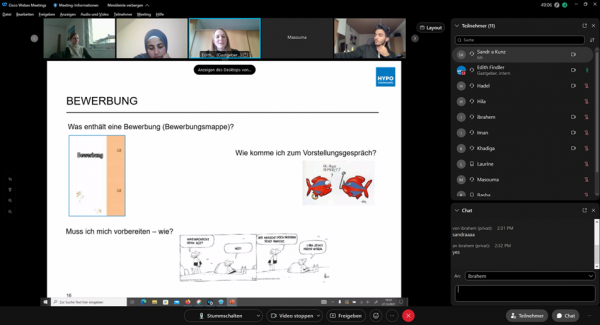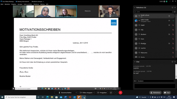 Am 27. Dezember fand das Bewerbungstraining mit einem Profi für die StipendiatInnen von START-Vorarlberg online statt. Zu Beginn des Workshops stellte sich unsere Workshop-Leiterin Frau Edith Findler, vor und anschließend fragte sie uns nach unseren Erfahrungen mit Bewerbungen und demnach haben wir eine Vorstellrunde durchgeführt. Sie erzählte uns natürlich auch über die Hypo Bank.