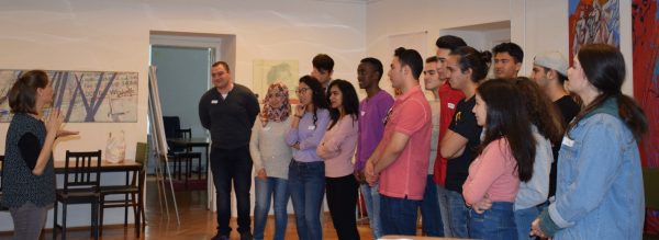 Beim ersten Theater-Workshop am 8. Oktober 2017 ging es einmal darum Ideen zu sammeln und mit dem Theaterspiel warm zu werden. Es ist höchste Konzentration gefragt, wenn man auf der Bühne steht und mit allen Sinnen präsent ist. Wenn man als Gruppe agiert ist vor allem auch Zusammenarbeit und Rücksichtnahme gefragt. Bei einer der ersten Übungen probierten die StipendiatInnen in Zweierteams aus wie es ist, wenn man blind durch den Raum geführt wird oder eben den sehenden Part übernimmt. Von Unsicherheit, aber auch erhöhter Aufmerksamkeit berichteten diejenigen, die geführt wurden. Die Sehenden fühlten ein hohes Maß an Verantwortung.