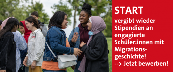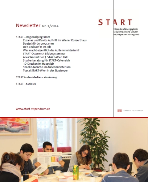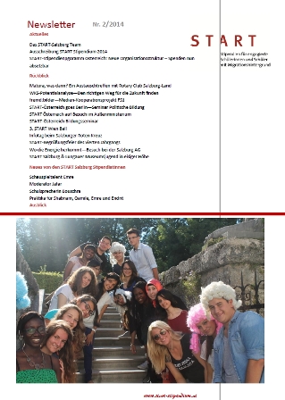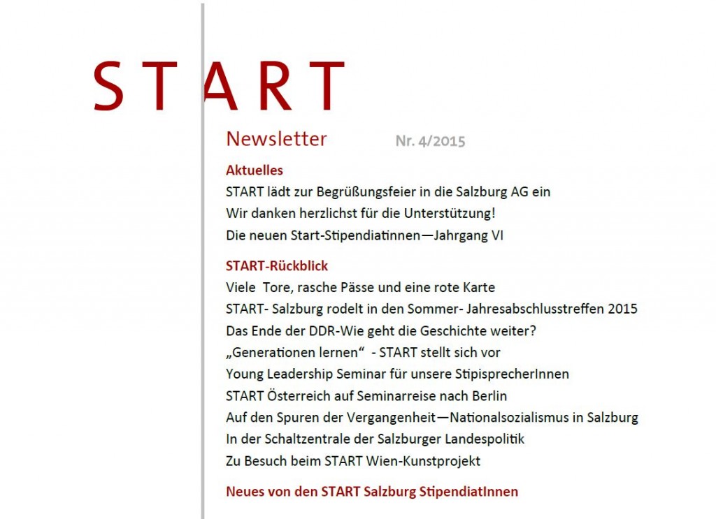Sehr geehrte Damen und Herren, Liebe START-Freundinnen und Freunde, wir freuen uns, Ihnen unseren 3. START-Newsletter, gefüllt mit Informationen zum START-Stipendium und unserem Regional-und Bildungsprogramm, übermitteln zu dürfen: Klicken Sie bitte auf das Bild um zum Newsletter zu gelangen Insbesondere möchten wir Sie auf die Ausschreibung des START-Stipendiums für das Schuljahr 2015/16 aufmerksam machen. Die