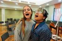 Zu Beginn wärmten sich alle auf, wobei die Chorleiterin erklärte wie wichtig es ist den Körper, unseren Resonanzraum, auf das Singen vorzubereiten. Dann fingen wir mit einfachen Stimmübungen an, dabei fand jeder heraus wo seine/ihre Stimmlage ist. Viele probierten auch aus wie hoch und tief sie singen können.