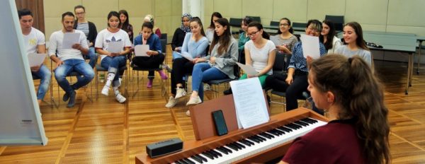 Als alle Stimmbänder aufgewärmt waren, begannen wir das Lied zu lernen. Das war gar nicht so leicht wie gedacht, denn man muss sich beim Singen nicht nur darauf konzentrieren den richtigen Ton zu treffen, sondern auch Textsicher sein.