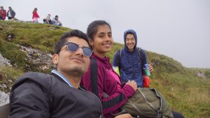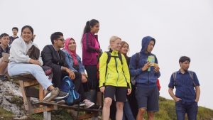 Von der Bergstation der Untersbergbahn wanderten wir noch etwa 30 Minuten bis zum Gipfel des Salzburger Hochthron. Unsere Stipisprecher Afra und Umair hatten ein lustiges Kennenlernspiel für uns vorbereitet. Zwei Touristinnen aus Südkorea erklärten sich freundlicherweise bereit, ein Gruppenfoto von uns zu machen. Danach gingen wir wieder zurück zur Bergstation. Wir hatten Glück, da gerade die Sonne herauskam und so konnten wir gemütlich auf einer Wiese picknicken. Viele hatten eine selbstgemachte Jause, Tascherl, Kekse und Muffins mitgebracht, mit der sich alle stärken konnten.