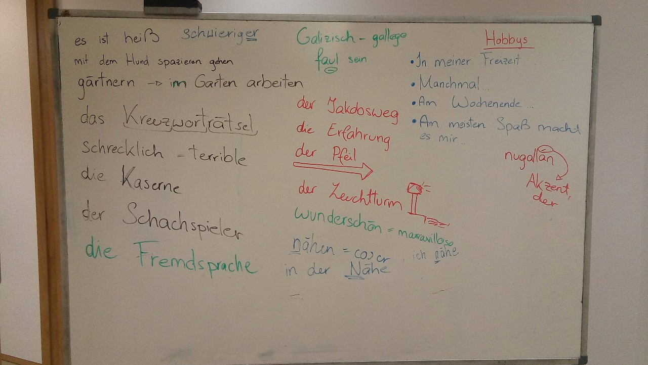 Ich hingegen sollte da als Freiwillige in dem Kulturzentrum „O Ensanche“ (Galicisch für „die Erweiterung“) arbeiten. Meine Tätigkeiten haben sich im Laufe der Zeit langsam vermehrt und verbessert. Wegen meinem gebrochenen Spanisch in den ersten Monaten verbrachte ich meine Zeit, indem ich die unterschiedlichen Aktivitäten des Zentrums kennen lernte und dabei assistierte. Exkursionen, Schachunterricht, ein Lesezirkel, Bastel- und Spielstunden mit Kindern waren alles Teil des Programms. Später konnte ich meine eigenen Kurse starten und initiierte Deutsch- und Englischkonversationskurse, sowie einen wöchentlichen Schachclub. Im Juli endeten sämtliche Kurse, denn es startete das Feriencamp „Pequenos Reporteiros“ (Kleine Reporter) für Kinder. Ich arbeitete als Betreuerin und organisierte Spiele und Aktivitäten.
