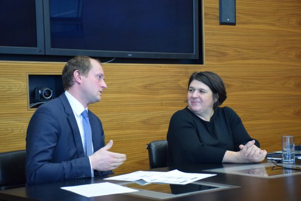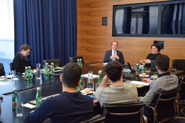 Zurück in der Zentrale, besuchten wir die Marketingabteilung, der Frau Skala vorsteht. Auch sie erklärte uns ihren Bereich ausführlich. Dann war es Zeit in der Kantine das Mittagsessen einzunehmen. Während wir in der Kantine sitzen, kam der Vorstand Herr Wolfgang Viehauser und begrüßte uns. Er sprach mit den StipendiatInnen, unter anderem darüber wie man ein Praktikum in der HYPO Bank absolvieren kann.
