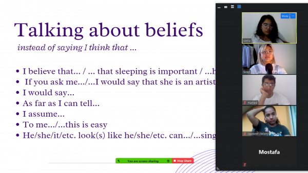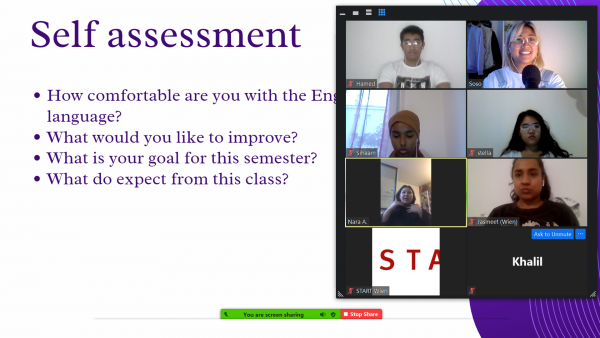 Zu Beginn haben die Stipis in einer Gruppenaktivität über sich selbst gesprochen, um einander besser kennenzulernen. Danach haben sie darüber Monologe geführt. Anschließend ist die Class mit „self assessment“ weitergegangen. In diesem Teil haben die Stipis Soso erzählt, wie es ihnen mit der englischen Sprache geht, welche Schwierigkeiten sie dabei haben, was sie verbessern möchten und was sie von der Conversation Class erwarten.