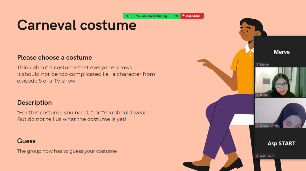 Passend zum Faschngsfest sind wir kreativ geworden und haben ein Kostüm beschrieben und dann konnten wir erraten welche Personen das sein könnte. Das war eine sehr lustige und coole Übung. Später haben wir über Online Classes gesprochen und unsere Erfahrungen mit diesem Thema geteilt. Am Ende konnten wir unserem 10 jährigen Ich Ratschläge geben und da waren ein paar echt inspirierende und spannende Ratschläge dabei, die man auch mitnehmen konnte. – Zeinab
