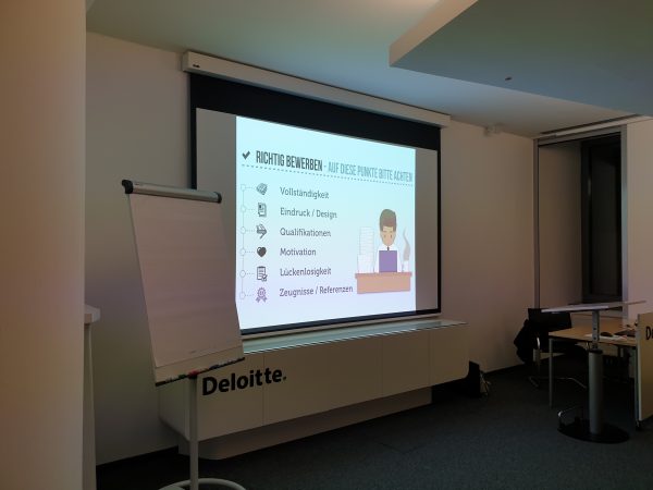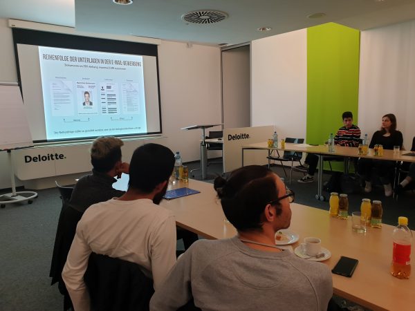 Ich habe mein Wissen bei dem Workshop erfrischt, weil ich vieles davon gewusst habe. Die Dame war sowohl ehrlich als auch hilfsbereit. Ich habe viele kleine Details erfahren, die den Eindruck bei einer Bewerbung deutlich verbessern. Wie zum Beispiel das unnötige doppelte Senden des Anschreibens. Von großer Bedeutung war die Tatsache, dass die Dame selbst viele Bewerbungen bekommt und sie uns Tipps aus ihrer Sicht geben kann. Ich bin dankbar, dass Deloitte uns gerne unterstützen will und dass die Personen aus der Organisation sich Zeit nehmen, um mit uns zu üben. -Mariana