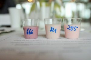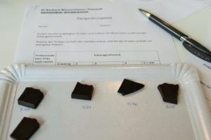 Als Drittes haben wir fünf verschiedene Schokoladesorten mit unterschiedlichen Kakaoanteil bekommen. Wir versuchten zu ordnen, wo am wenigsten Kakao und wo am meisten Kakao drinnen ist. Man schmeckte auch sehr eindeutig wo wenig und viel Zucker drinnen war. Dann haben wir auch noch einen Beliebtheitstest mit Milch/Joghurtgetränken gemacht. Dabei hat die Trainerin erklärt, dass es sehr wichtig ist, zu wissen welche Zutaten in den Lebensmitteln sind, welche wir kaufen.