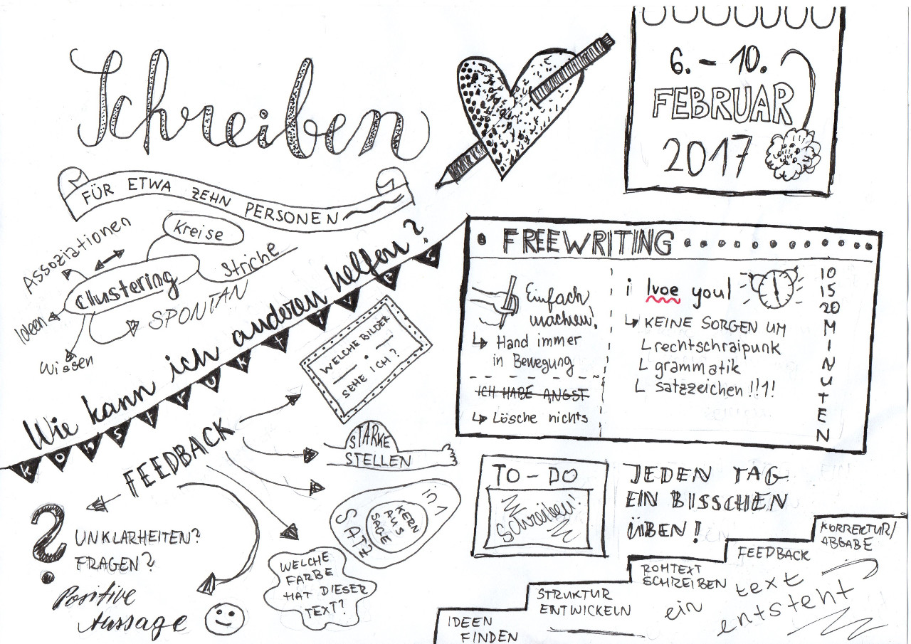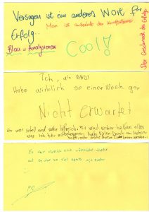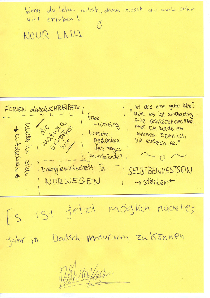 Bei im Durchschnitt 10 Minuten langen Freewriting-Einheiten haben wir unseren Gedanken freien Lauf gelassen. Während des Schreibens eines „This I Believe-Essays“ wurde uns bewusst, dass wir mit unseren Worten für uns wichtige Überzeugungen vielen Menschen vermitteln können. Am Ende der Woche waren unsere Hefte voll mit Gedanken über unsere ersten Gedanken in der Früh, Winter, Kaffee, Meinungsreden zu Themen wie soziale Medien oder Arbeiten als Schüler_in und wir haben anderen Teilnehmer_innen genügend vertraut, um ihnen durch Postkarten von Landschaften inspirierte kurze Gedichte vorzulesen.