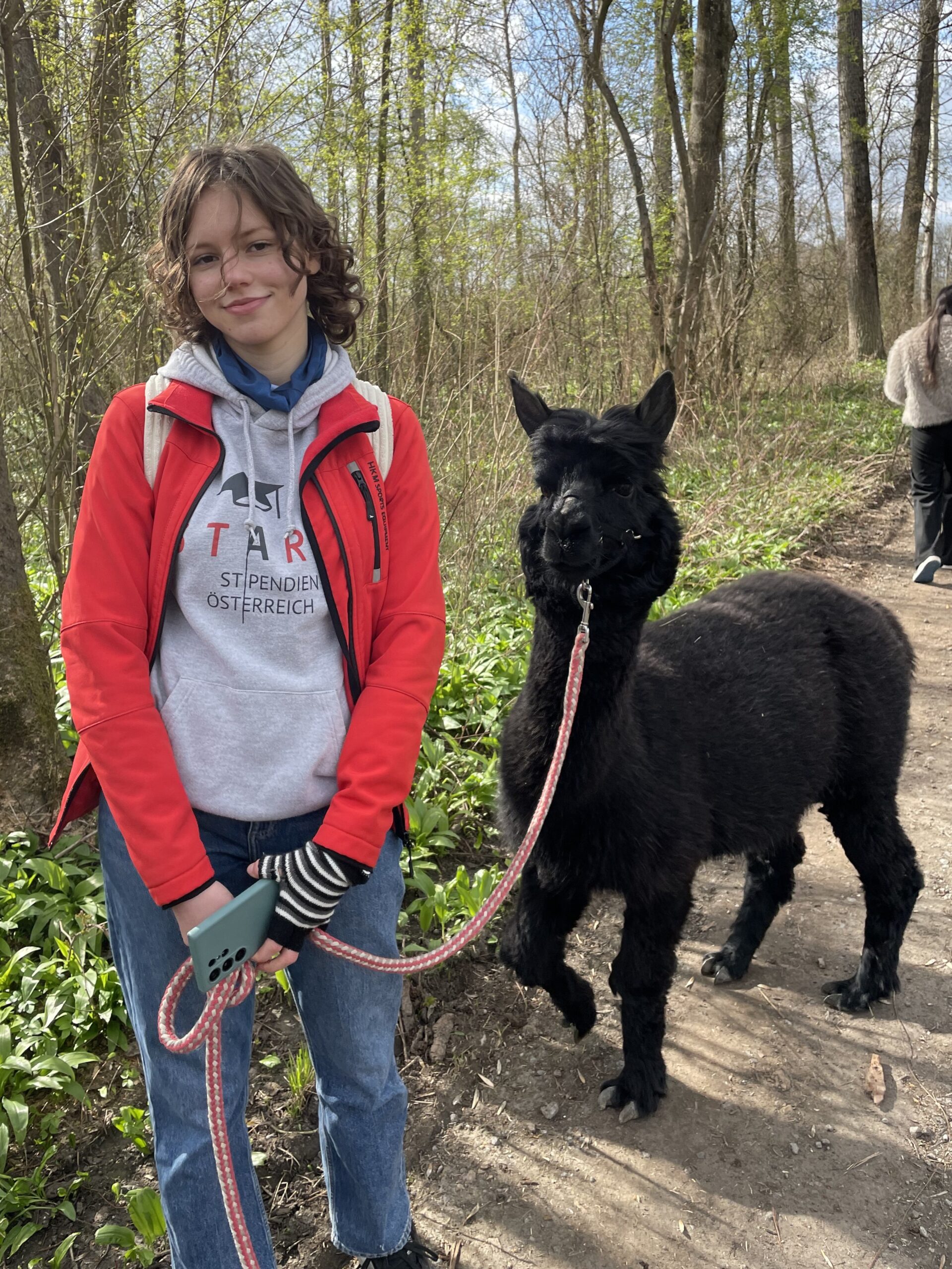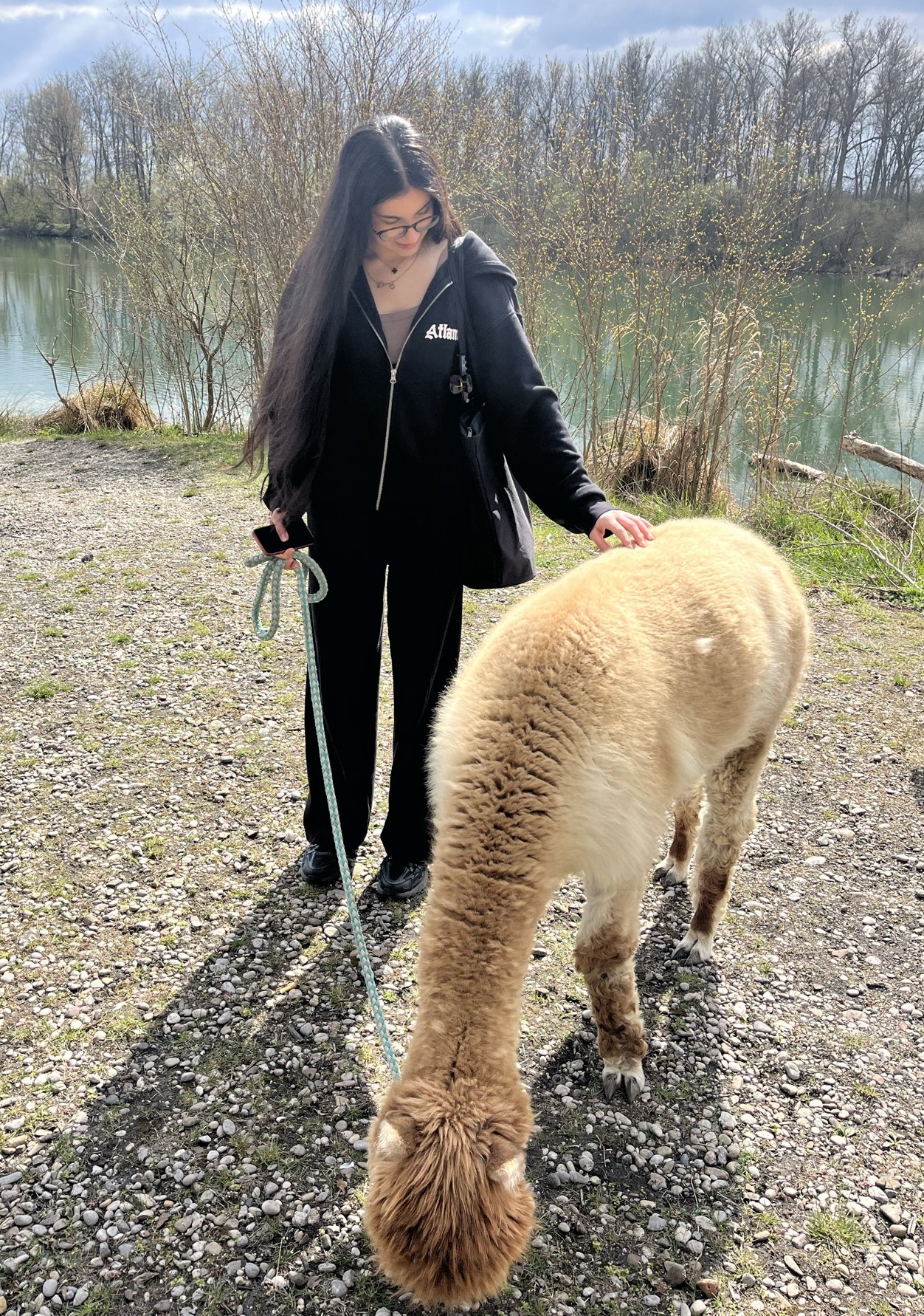 Zuerst durfte ich mit Napucko (ein Lama) spazieren. Er war super entspannt und obwohl er größer war, hatte ich keine Probleme bei dem Spaziergang im Wald, obwohl wir sind mehrere Male stehen geblieben für Blätter-Snackpausen. Danach durfte ich Lenos an der Leine führen, ein kleineres schwarzes Alpaka. Nach der Wanderung wurden wir auf einen leckeren Kuchen und Hauslimonade auf dem Alpakahof eingeladen. Dort durften wir auch die weiblichen Alpakas bestaunen. Alles in einem, war es ein sehr toller Tag, den ich auf jeden Fall wiederholen möchte.