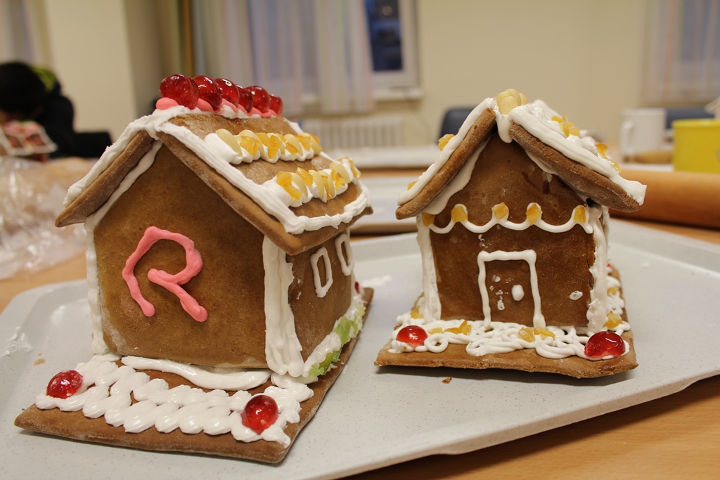 “ Wir versammelten uns am vereinbarten Treffpunkt.Alle waren anwesend bis auf Leila. Sie konnte aufgrund einer Verkühlung nicht erscheinen. Danach machten wir uns aufdie Arbeit.Jeder backte mindestens einen Lebkuchenhaus für die jeweiligen Paten, was nicht sehr einfach war, da es immer wieder zusammenbrach. Herzförmige Kuchen und Kekse in zahlreichen Formen standen ebenfalls auf dem Programm.