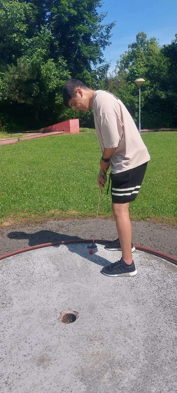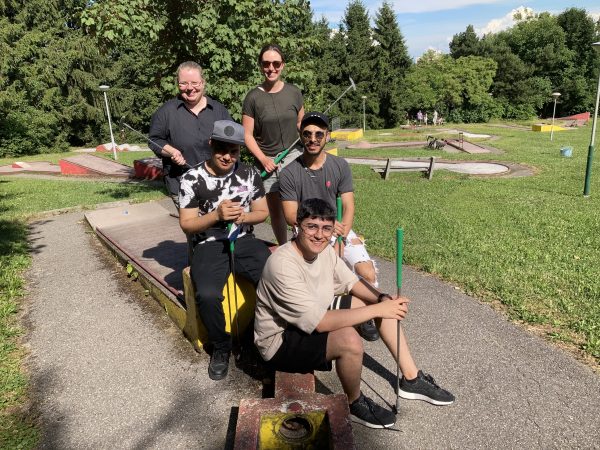 Bei heißen Temperaturen probierten wir uns an verschiedenen Stationen. Insgesamt gab es 18 Bahnen und man hatte je Bahn höchstens 7 Versuche den Ball in das Loch zu befördern. Von relativ einfachen Hindernissen bis zu Bahnen, die unter 7 Schlägen so gut wie nicht schaffbar waren, war alles dabei. Dafür, dass es manche von uns auch zum ersten Mal ausprobiert haben, funktionierte das Spielen schon sehr gut. Als kleine Abkühlung gab es auch eine Runde Eis für alle.
