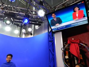 Als nächstes konnten wir einen Einblick in ein Nachrichtenstudio bekommen. Der Bildschirm in diesem Studio war 11m² groß und ist der Größe EU-Weit. Die Studio-Kamera wiegt 75 kg und muss sich lautlos auf den Rollen bewegen lassen. Die Studio-Kamera die Videos aufnimmt, teilt sie sie in 3 Farben: Rot, Grün und Blau und leitet sie digital zu dem Regieplatz weiter, wo sie bearbeitet werden. In so einem Regieraum sitzen viele Leute, die einen sind für die Bildregie und die anderen für die Tonregie verantwortlich.