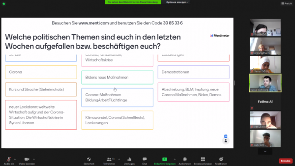 „Ich fand den Workshop sehr interessant, denn man konnte sehr vieles zum Thema Corona, Impfen, Wirtschaftskrise und Politiker mitnehmen. Wir haben über diesen Themen miteinander diskutiert und haben auch vieles aus anderen Perspektiven betrachtet. Vielen Dank an Pascal und START für diese tolle Gelegenheit.“ (Sharifa)