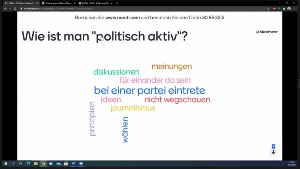 „Ich fand es interessant, wie wir über alle politische Themen, die wir gewählt haben, diskutiert haben. Am meisten hat mir das Coronaimpfungsthema gefallen, da ich der Meinung vieler anderer gehört habe. Ich mochte, wie Pascal uns am Ende die Instagram-Site von 4 Politikern gegeben hat und uns diese analysieren lassen hat.“ (Tamara)