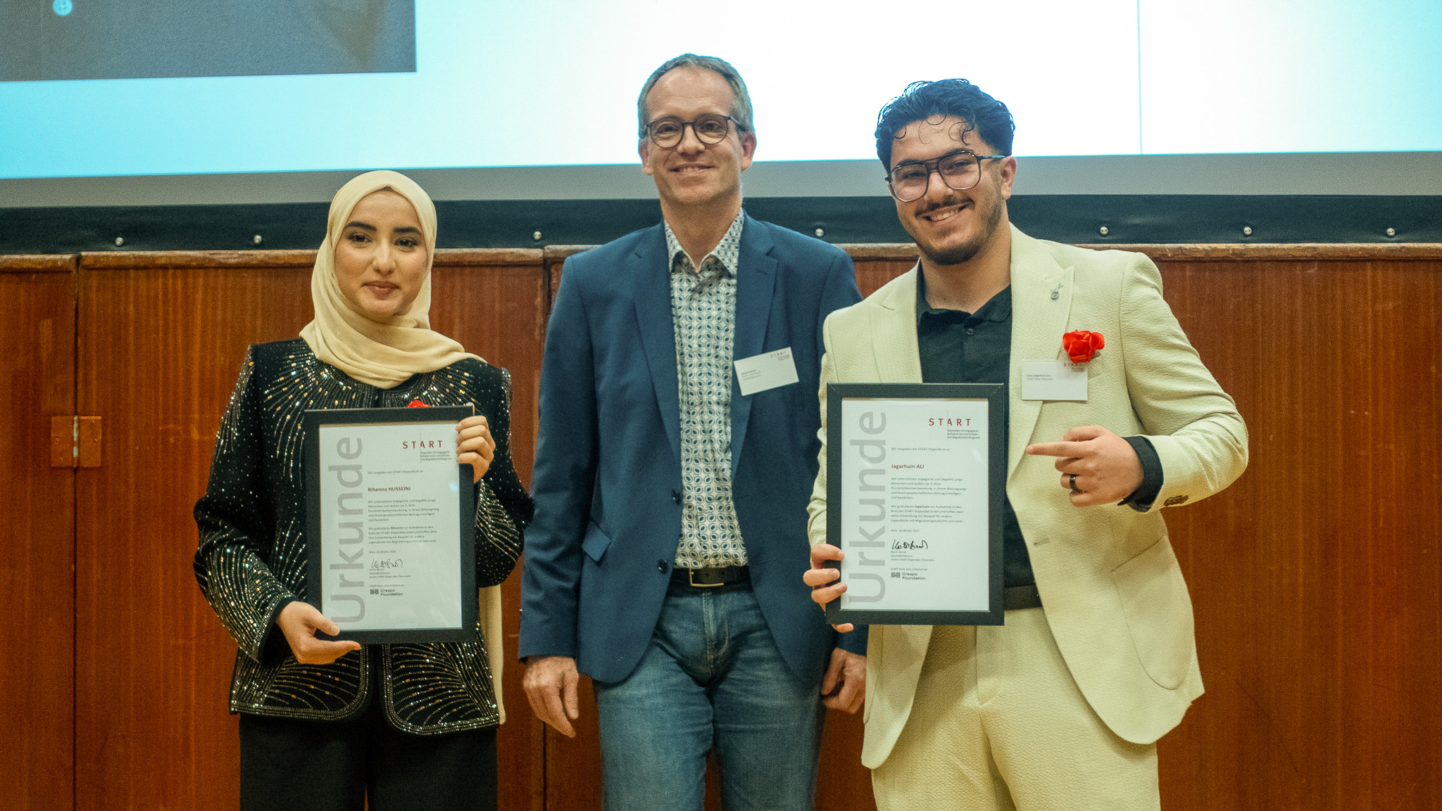 Am 16. Oktober wurden bei der jährlichen Begrüßungsfeier die neuen Stipendiat:innen feierlich im Programm aufgenommen sowie 19 erfolgreiche Maturant*innen verabschiedet. Darüber hinaus bekamen 20 Jugendliche im START-Freundeskreis einen Platz. Insgesamt werden aktuell 56 Jugendliche mit Migrations- und Fluchterfahrung auf ihrem Bildungsweg von START-Stipendium in Wien unterstützt. Wien, 21.10.2025 – Das von der Crespo Foundation im Jahr 2006 initiierte Stipendienprogramm arbeitet seit 19 Jahren mit großer Hingabe für die Förderung von Jugendlichen mit Migrationsgeschichte. Bisher wurden allein in Wien 287 Stipendiat*innen erfolgreich auf ihrem Weg zur Matura unterstützt. Am vergangenen Donnerstag kamen 17 Jugendliche neu dazu, welche bei der Begrüßungsfeier in der VHS Praterstern in Wien offiziell aufgenommen wurden. Gleichzeitig wurden die 19 Absolvent:innen, welche zwischen ein bis vier Jahren von START-Wien begleitet wurden, für ihren Matura- oder Fachschulabschluss gefeiert. Außerdem bekamen 20 Schüler*innen im START-Freundeskreis einen Platz, in welchem sie ähnlich wie im Stipendium in bildungsrelevanten Angelegenheiten finanziell entlastet als auch pädagogisch begleitet werden. Die Stipendiaten Rihanna Husseini und Jagarhuin Ali bekommen von Herrn Michael Ruess, dem Market Director für die Active Cosmetics Divisions von L’Oréal Österreich ihre Urkunde überreicht.