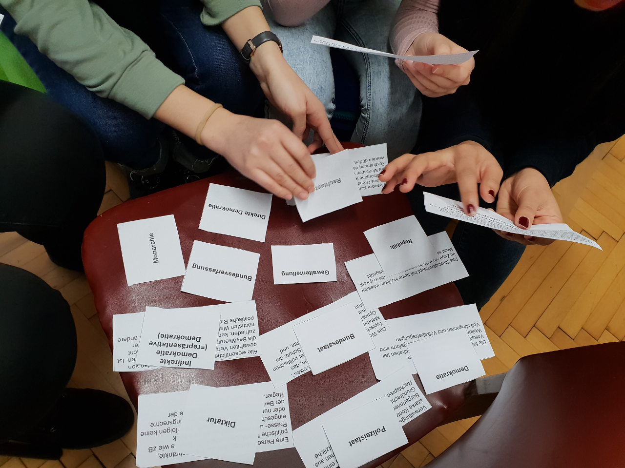 Nachdem wir darüber sprachen, mit welchen Wörtern wir Medien verbinden, haben wir uns in kleineren Gruppen geteilt und Wörter wie direkte Demokratie, Monarchie, Demokratie zu deren Definitionen zugeordnet. Mit diesem Vorwissen haben wir die Unterschiede zwischen Meinungs- und Pressefreiheit besprochen, wobei dies zu einigen Diskussionen geführt hat. Dank den Diskussionen konnten wir aber wiederum unsere eigene Meinung zum Thema äußern.