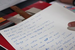Eine sehr abwechslungsreiche Methode war das » Free Writing «, die wir zum Aufwärmen gebraucht haben. Dabei schreibt man für mindestens 10 Minuten im Automatismus ohne den Stift abzusetzten.