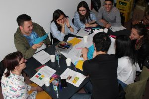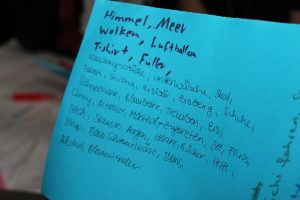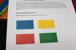 Um ein bisschen Spaß zu dem Unterricht hinzuzufügen, hat uns Alexandra mit einem lustigen Spiel beschäftigt, wo wir zweifärbige Blätter bekommen haben und darauf Wörter schreiben sollten, die wir mit diesen beiden Farben assoziiert haben. Die Wörter, die dabei herauskamen, waren wirklich lustig.