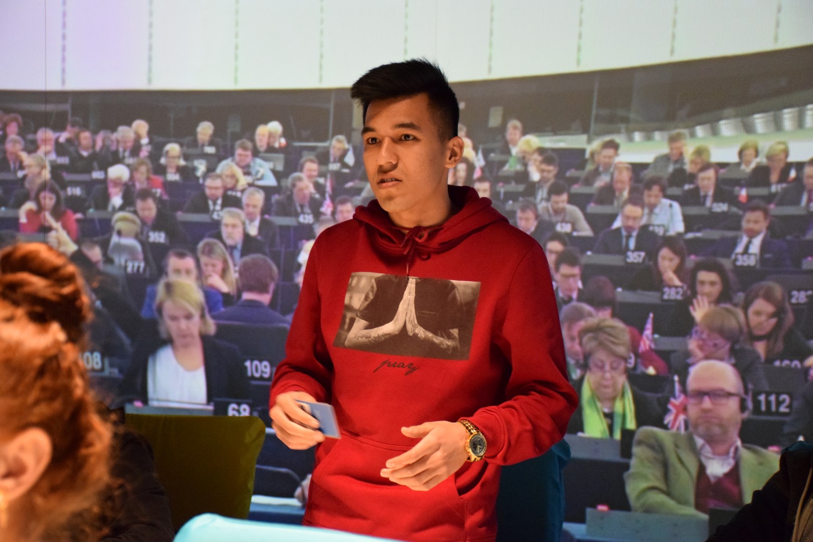 Donnerstag waren wir beim europäischen Haus. Dort hatten wir die Möglichkeit, die Rolle der Parlamentsmitglieder zu spielen, wo wir eine Diskussionsrunde über Plastikbechern und Umweltverschmutzung durchgeführt haben. Wir hatten viel Spaß beim Rollenspiel. Es war ein wunderbares Erlebnis. Nachher hatten wir Freizeit. Dann hatten wir die Chance, uns mit uns im deutschen Dom mit der Geschichte des Parlaments auseinanderzusetzen. (Khlod)