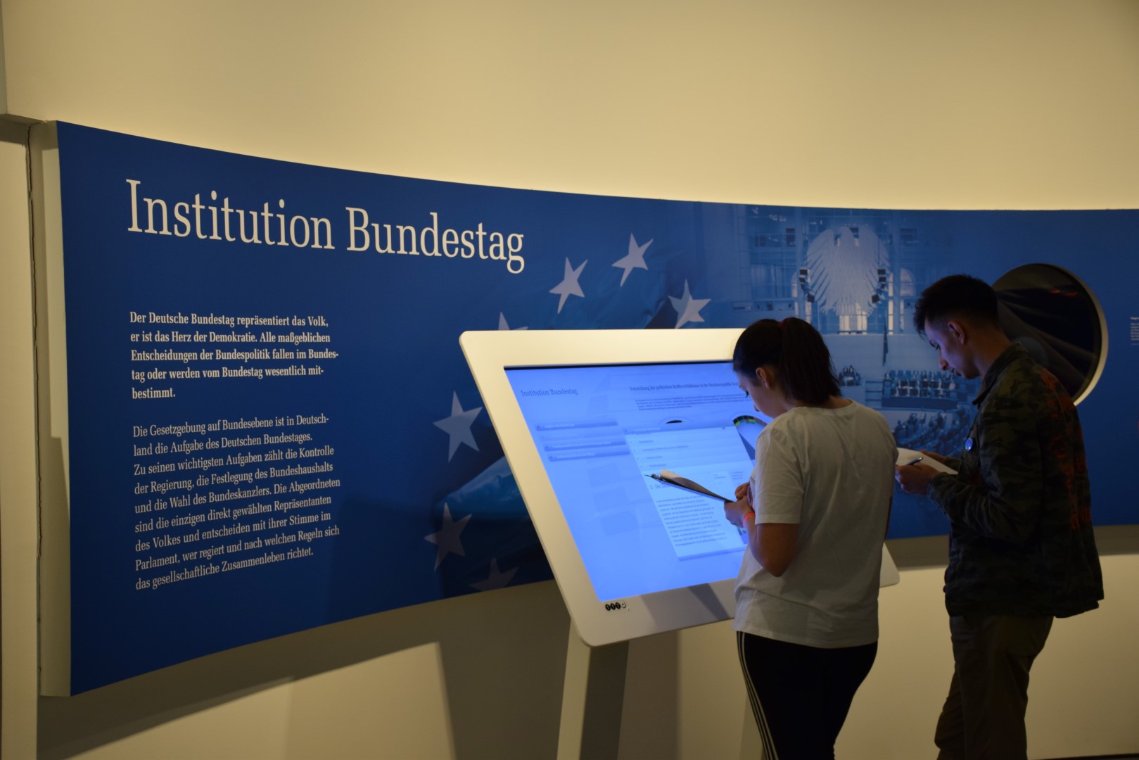 Am vierten Tag unserer Reise durften wir den deutschen Dom besuchen. Da haben wir uns mit der Funktionsweise des Bundestags beschäftigt und haben die Rolle von „Bundestagsabgeordneten“ übernommen, um einen besseren Überblick zu bekommen, wie Entscheidungen getroffen werden. Außerdem wurden Infos über die Arbeit von Bundestagsabgeordneten, den Gang der Gesetzgebung, den Ablauf einer Sitzungswoche, die Struktur und Sitzordnung im Plenarsaal, die Funktionen der handelnden Parlamentarier sowie den Ablauf einer Plenarsitzung vermittelt.