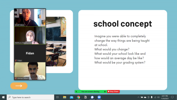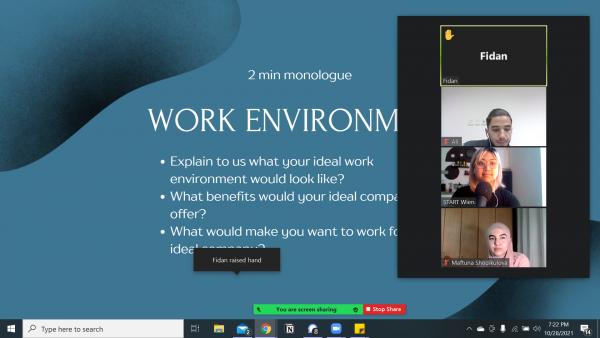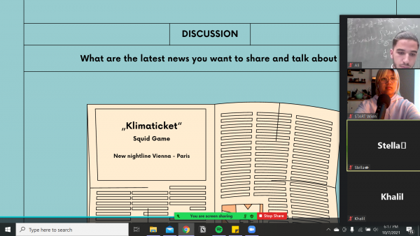 Im September startete ein neues Semester und Schuljahr – die erste Class wurde dementsprechend dem Kennenlernen der Teilnehmer:innen gewidmet. Anstatt sich jedoch selbst vorzustellen, wurde diese Task in eine Gruppenarbeit umgewandelt und gleich mit neu gelernten bzw. schon einmal gehörten Phrasen verbunden. Die Aufgabe war es zu jeweils einer anderen Person im Meeting sämtliche Behauptungen niederzuschreiben. Hobbys, Wunschberuf, Geschwister, etc. zählten zu den herauszufindenden Infos.