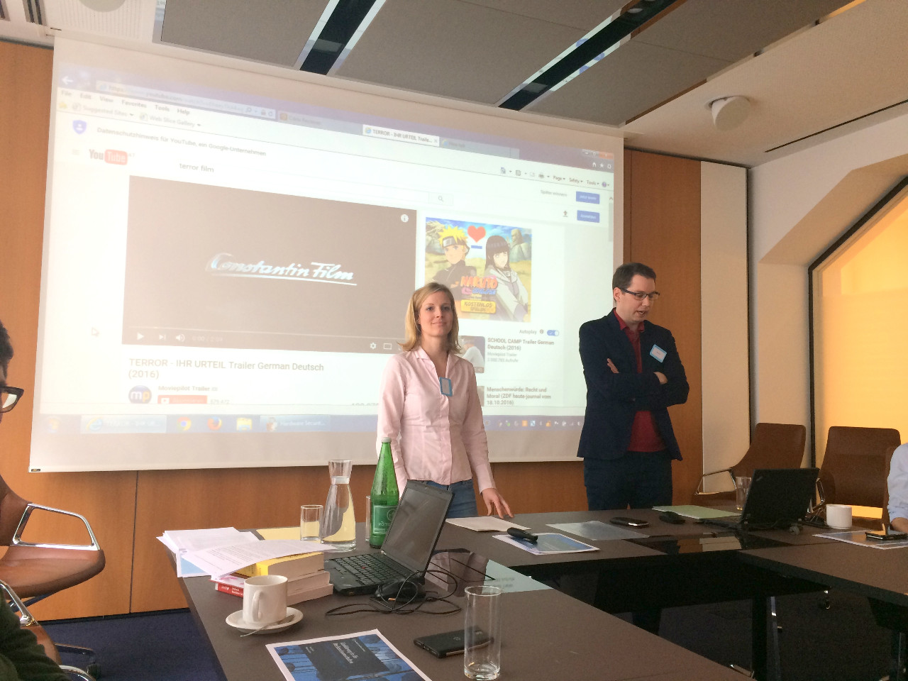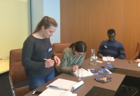 Im letzten Teil des WOrkshop wurden die StipendiatInnen in 3 Gruppen geteilt und musstein einen fingierte Fall in der Rolle von Staatsanwaltschaft, Verteidigung oder Richter übernehmen. Bearbeitet wurde der im TV ausgestrahlte Fall „Terror“ , und es musste juristisch die Frage beantwortet werden: Darf man 164 Menschen töten, um 70.000 zu retten? Durfte der Kampfpilot Lars Koch ein Passagierflugzeug abschießen, um zu verhindern, dass ein Terrorist dieses auf ein vollbesetztes Fußballstadion stürzen lässt?