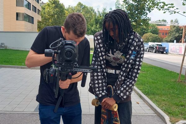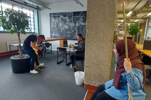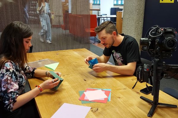 Wer mit dem Vorstellen fertig war, ging zum nächsten Teil des Videodrehs: „Die B-Rolle“, wie die Profis sie benennen. Manche spielten auf irgendeinem Instrument, andere zeigten ihre sportlichen Fähigkeiten, während ein paar auch praktische Talente präsentierten: Nähen, Blutdruck messen, Origami, Kalligraphie…Ein vielfältiges Team voller Potenzial- das konnte man an dem Tag im START-Büro erblicken.