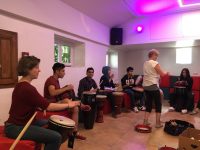Am ersten Tag stand außerdem ein Trommelworkshop an der Tagesordnung. Zur Auflockerung und um den Rhythmus zu fühlen durften wir anfangs zum Trommeln der Workshopleiterin tanzen und danach bekam jede*r eine eigene Trommel und der richtige Spaß begann. Es war nicht ganz so einfach wie man sich das vorstellt, doch trommeln macht unglaublichen Spaß – zumindest bis die Handflächen anfangen zu brennen. Ein Highlight war auch die etwas neue Ausführung vom Fetzenfußball, das wir bereits beim letzten Jahrestreffen gespielt hatten. Die Schwierigkeit lag hierbei darin, die Anzahl der Trommelschläge rauszuhören, die die Workshopleiterin schlug. Das mag peinlich einfach klingen, doch in Wirklichkeit ist das fast schon eine Kunst für sich. Den Abend haben wir dann mit verschiedenen Freizeitaktivitäten ausklingen lassen – führend war dabei erneut das Trampolin, aber auch der Aufenthaltsraum mit Billard und Co kam gut an bei den Stipis.