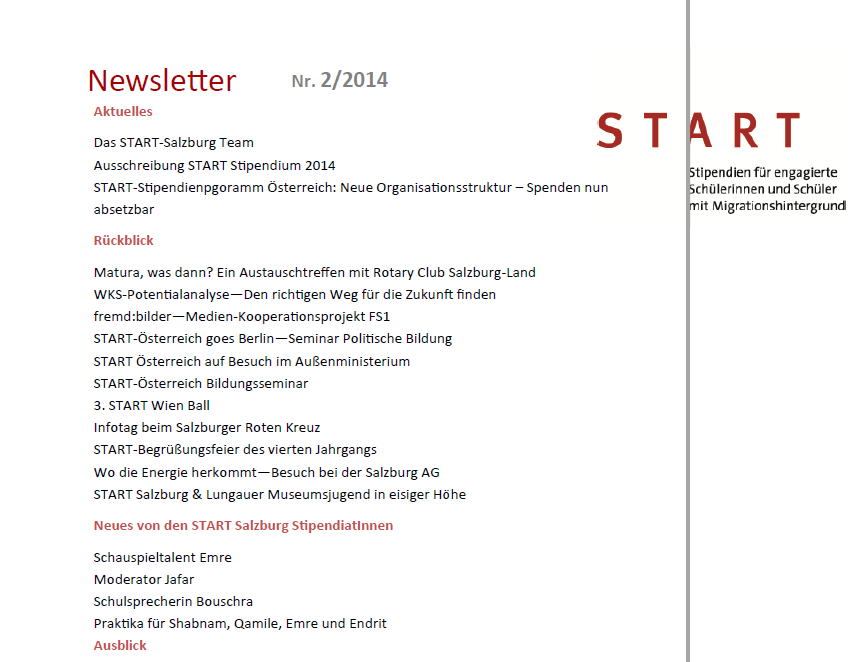 START-Salzburg Newsletter Nr. 2/2014By admin / 1. Juni 2014 Klicken Sie bitte auf das Bild um zum Newsletter zu gelangen