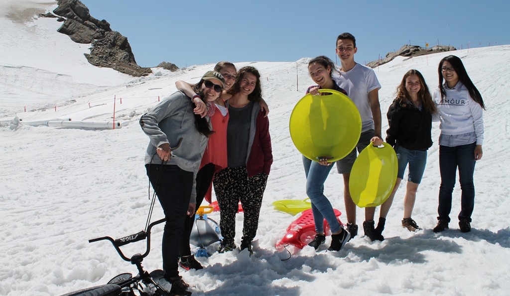 „Top motiviert starteten wir Samstagmorgen das Programm mit einer 50 minütigen Gletscherbahnfahrt hinauf auf das 3500m hohe Kitzsteinhorn. Nach einer Wanderung durch den Gletschertunnel, betrachteten wir den atemberaubenden Ausblick von der Aussichtsplattform des Gletschers. Es hat nicht lange gedauert  bis wir die Rodelbahn entdeckt haben und uns sofort in den kalten Schnee stürzten. Dies hat besonders viel Spaß gemacht, da keiner von uns damit gerechnet hat am vierten Juli rodeln zu gehen.