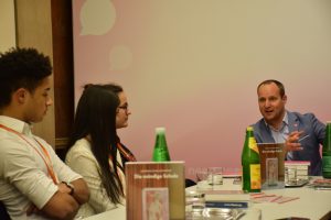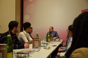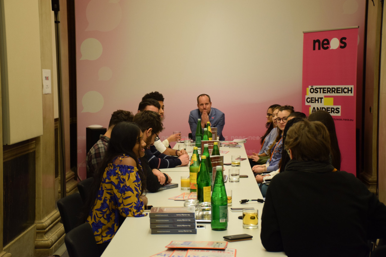 Am Anfang haben wir mit Matthias Strolz, Vorsitzender und Gründungsmitglied von NEOS (Das Neue Österreich und Liberales Forum), eine Diskussion gehalten. Er hat Fragen unsererseits beantwortet, hat über die Gründe der Gründung von NEOS erzählt und über ihre Aufgabe im Parlament und Pläne berichtet.