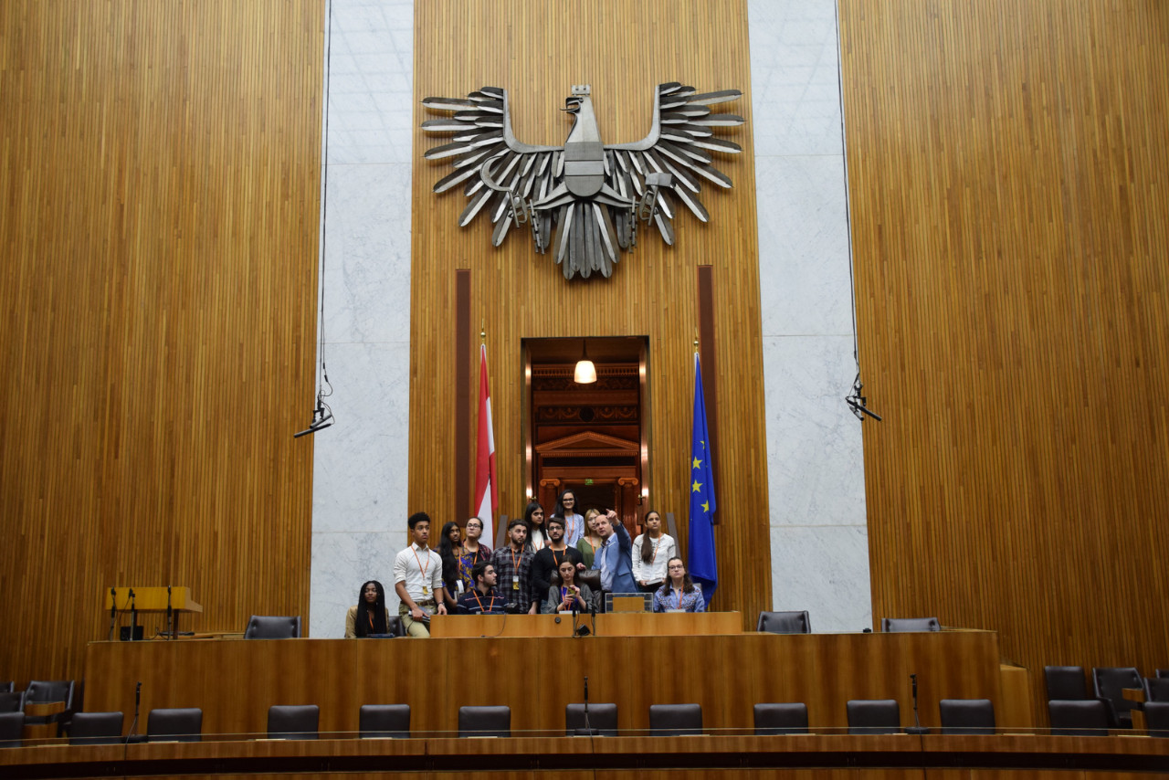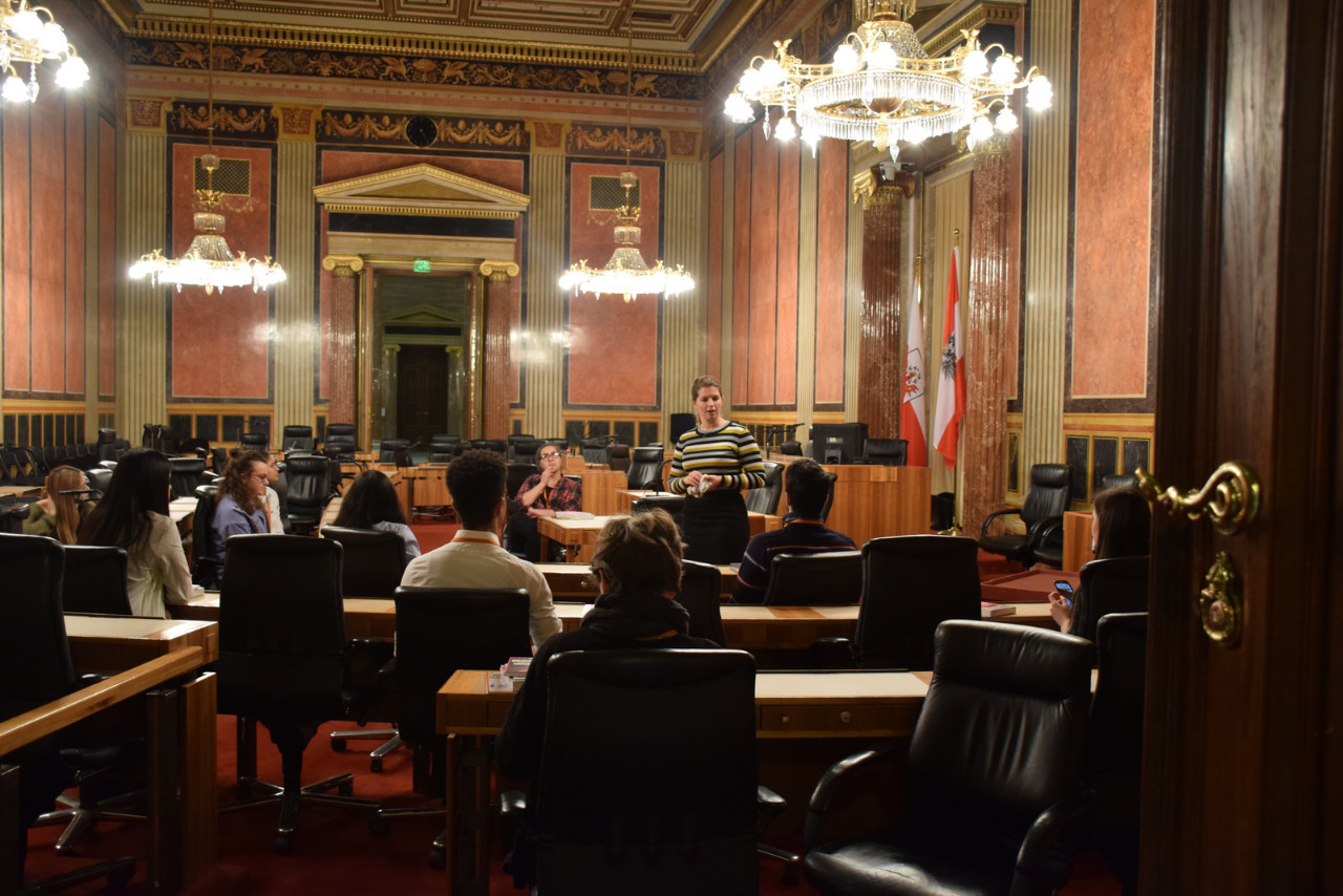 Anschließend bekamen wir einen Rundgang im Parlament: Wir betrachteten den Nationalrats-Saal, Bundesrats-Saal, historischen Sitzungssaal und die Säulenhalle. Zwischendurch gab es Fragen von uns, die von einer Mitarbeiterin von NEOS beantwortet wurden.