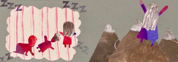 Ein Kind schläft auf einem Elefanten, der es zum Mt. Everest bringt. Samt dem schlafenden Kind durchquert der Elefant alle Jahreszeiten, muss über eine schmale Brücke und wird von rosavioletten Fischen durch einen Strudel geleitet. Schließlich erreichen sie eine Achterbahn, wo das Kind sachte den Rüssel des Elefanten hinabgleitet, um in einem weichen Bett zu landen, wo es weiterschläft. Das Kind hat die gesamte Reise geschlafen. (Saida, 18 Jahre, aus Afghanistan) Salma (17 Jahre, aus Ägypten) erzählt: Ich reise in einer sicheren Box zum Mt. Everest. Die Reise geht durch eine schwarzblaue Galaxie, die ihre Sterne durch weiße Farbspritzer erhielt. Die Box wandert selbstständig hinauf, bis an die Spitze. Oben lege ich mich in mein Bett und schlafe. Erem (16 Jahre, aus der Türkei/Kurdistan) liegt im Bett und träumt: Ein Boot bringt ihn durch ein Tor ins Weltall, er passiert Galaxien mit verschiedenen Farben. Schließlich kommt er wieder auf die Erde und findet dort den Mt. Everest.