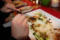 Es wurde zum Beispiel lange diskutiert, in welchen Situationen und ob überhaupt man den Titel beim Vorstellen erwähnen darf. Wir durften am diesen Tag auch selbst ein bisschen denken und konnten anschließend ein kleines Referat über ein gutes, selbstbewusstes und sicheres Auftreten halten. Inzwischen brachte uns Sandra eine kleine Jause, die uns wieder auf die Beine brachte. Während uns in der zweiten Hälfte des Ganzen ein viergängiges, prächtiges Mahl serviert wurde, lernten wir den Umgang mit dem Messer, der Gabel und dem Löffel. Frau Hieble-Tomio zeigte uns, was man mit der Serviette machen muss, bevor wir anfingen zu essen. So verbrachten wir von 8:30 bis 14:00 Uhr einen schönen und informativen Vormittag.