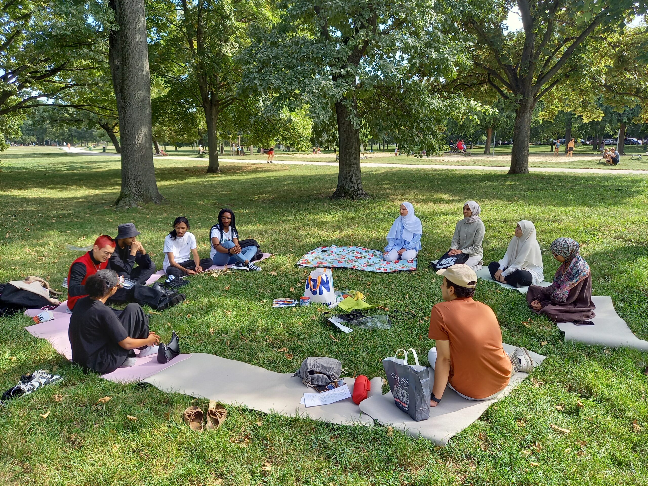 Da ich kreatives Schreiben schon als Wahlpflichtfach in der Schule habe, war der WS mit Tasmim schreiben einfach das beste, ich liebe es Sachen aufzuschreiben und zu dokumentieren und vor allem wenn es Fragen sind die mich zum Nachdenken erregen, das hilft mir dabei, bei der Sache hier und Jetzt zu bleiben und mal mein Leben zu pausieren, vor allem weil der WS noch draußen stattgefunden hat, war die Atmosphäre beim Schreiben noch angenehmer. ~Zainab