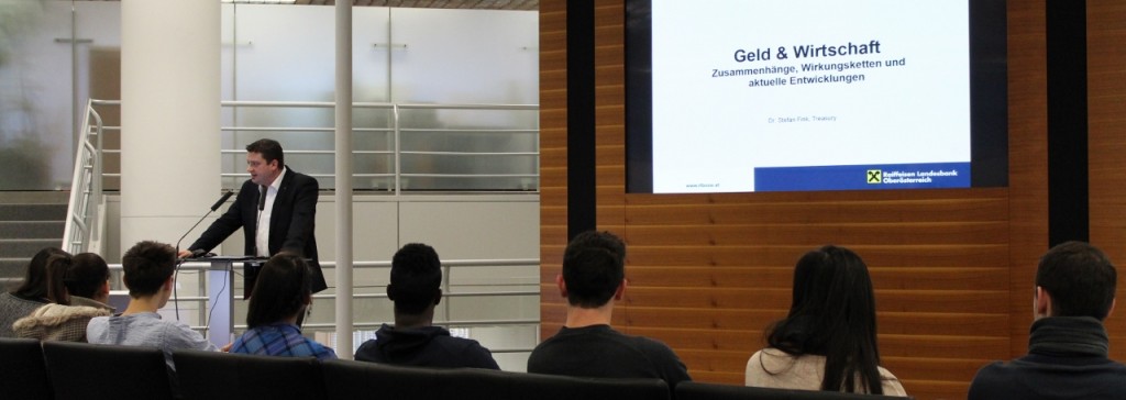 Auf eine Einladung unseres Paten und Förderers besuchten wir am Donnerstag den 05. 02. 2015 die Raiffeisenlandesbank Oberösterreich. Zuerst erklärte uns Mag. Florian Brunner die Entstehung und Geschichte der RLB und wie die Infrastruktur der Bank sich entwickelte und führte gemeinsam mit Generaldirektor-Stellvertreterin Mag. Michaela Keplinger-Mitterlehner durch das Haus.