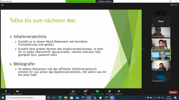 Der erste Teil des Workshops bestand aus Informationen über Literaturrecherche. In diesem Teil hat Julia uns erklärt, wie wir eine seriöse, wissenschaftliche und gute Literatur für unsere Arbeit finden könnten und danach fragte sie jeden von uns, was wir konkret brauchen. Sie hat uns allen sofort Vorschläge gemacht und versucht, mögliche Probleme aufzulösen.