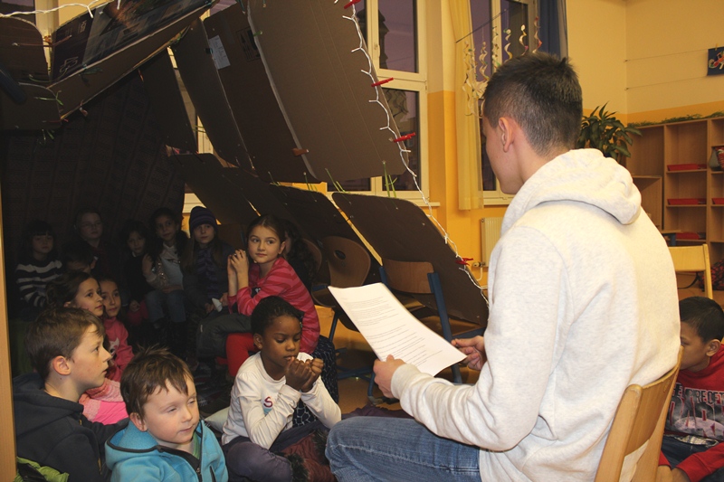 Die Kinder der Volksschule konnten zwischen Geschichten auf Albanisch, Tschetschenisch, Türkisch und Bosnisch wählen. Für alle anderssprachigen wurden die Geschichten zusätzlich auch auf Deutsch angeboten. Durch das lebensgroße Lebkuchenhaus aus Pappe gelang es den Stipis eine besonders märchenhafte Atmosphäre zu erzeugen.