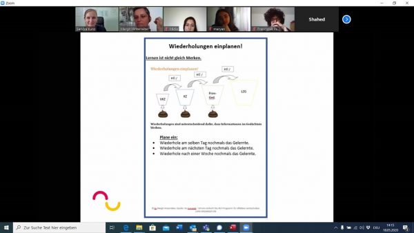 „Der Workshop mit Margit Hinterreiter, unserer Workshopleiterin, ist einfach super. Vergangene Woche haben wir ein paar Tipps bekommen, wie wir unseren Biorhythmus langsam wieder an den Schulalltag anpassen können. Zuerst hat sie uns gefragt, wie es uns dabei ergangen ist und wir haben alle überraschend festgestellt, dass uns das Lernen zuhause schon viel leichter gefallen ist als noch die Wochen zuvor. Wir haben darüber gesprochen, was für eine Bedeutung Ramadan für uns hat und wie wir das Lernen mit dem Fasten verbinden können.